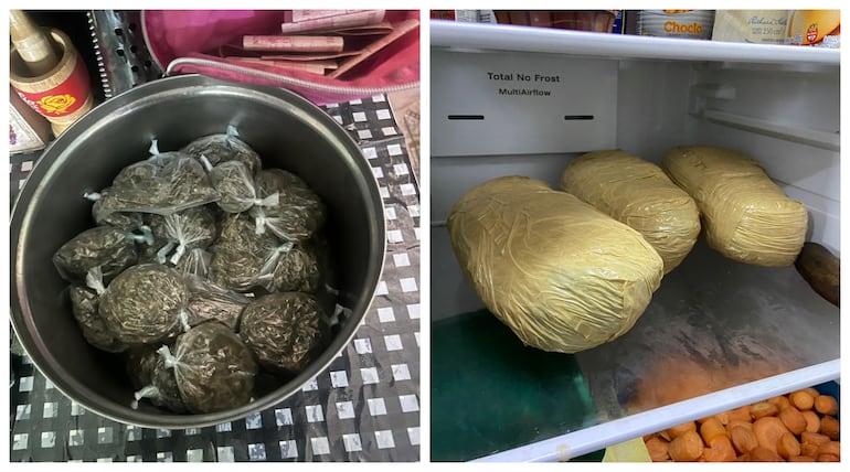 Tras el allanamiento del inmueble, los agentes lograron confiscar marihuana en diversas porciones, que arrojó 240 gramos. Dicho contenido fue encontrado dentro de una cacerola. Posteriormente se sumaron tres paquetes con un peso total de 1 kilo y 545 gramos de la misma droga. Estos últimos paquetes estaban en la heladera.