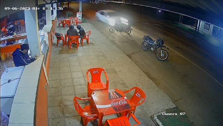 El suboficial 1º de Prevención y Seguridad Martín Ríos Báez (31) embistió con su automóvil una motocicleta estacionada frente a un local gastronómico ubicado al costado de la Ruta PY01, en el km 321, distrito de Coronel Bogado del departamento de Itapúa.