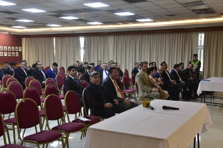 La audiencia fue fijada para hoy, lunes, a las 08:00, pero el fiscal interino Carlos Alcaraz recién pudo hacerse presente en la sede judicial a las 08:40 aproximadamente, a pesar que se otorgó un período de tolerancia que se extendió hasta las 08:35.