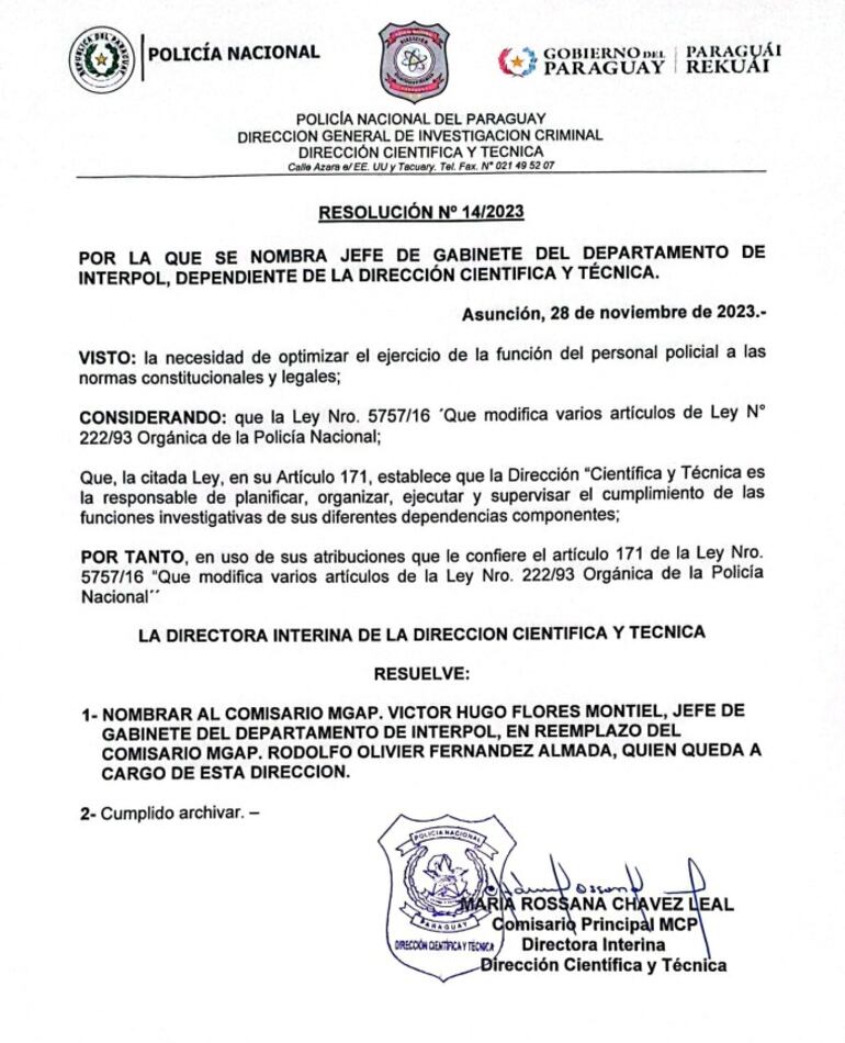 A través de las redes sociales, la Policía Nacional anunció que el jefe de Gabinete de Interpol Paraguay fue destituido. “La Policía Nacional informa que en prosecución a la intervención del Departamento de Interpol OCN Asunción, la directora interina de la Dirección Científica y Técnica Crio. Ppal. MCP. María Rossana Chávez Leal, resuelve reemplazar al jefe de Gabinete, comisario MGAP. Rodolfo Olivier Fernández Almada”, reza el comunicado.