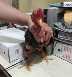 Según el informe de la dependencia estatal, se trataba de un ave de la raza asil, macho adulto, condición corporal delgada, alopecias y dermatitis en varias partes del cuerpo.