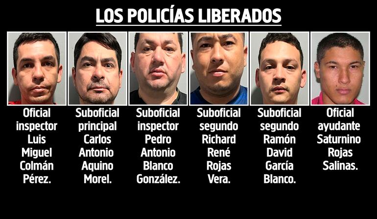 Los policías favorecidos con la libertad ambulatoria son el oficial inspector Luis Miguel Colmán Pérez (36), suboficial principal Carlos Antonio Aquino Morel (48), suboficial inspector Pedro Antonio Blanco González (35), suboficial segundo Richard René Rojas Vera (27) y suboficial segundo Ramón David García Blanco (28), quienes prestaban servicios en el departamento de Investigaciones de Asunción.