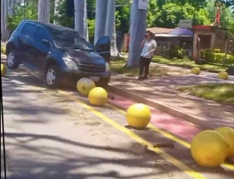 Un automóvil de la marca Toyota IST de color negro se llevó por delante al menos seis bolardos amarillos de cemento, según se puede observar en el video compartido en las redes sociales. Se observa al vehículo sobre un bolardo y otros que, tras el impacto, estaban fuera de su lugar.