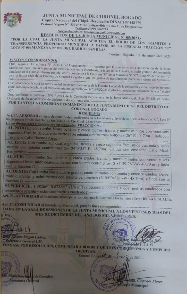 Por resoluciones número 05 y 06 del 2 de enero del 2024 la comisión permanente de la Junta Municipal dispuso la entrega en donación y el inicio de los trámites de transferencia de fracciones de inmueble de dominio privado municipal para sedes de la Fiscalía Zonal de Coronel Bogado y para asiento del Registro Electoral. Ambas resoluciones ya fueron promulgadas por el intendente municipal, Héctor Céspedes Flores (PLRA), y es inminente su ejecución.