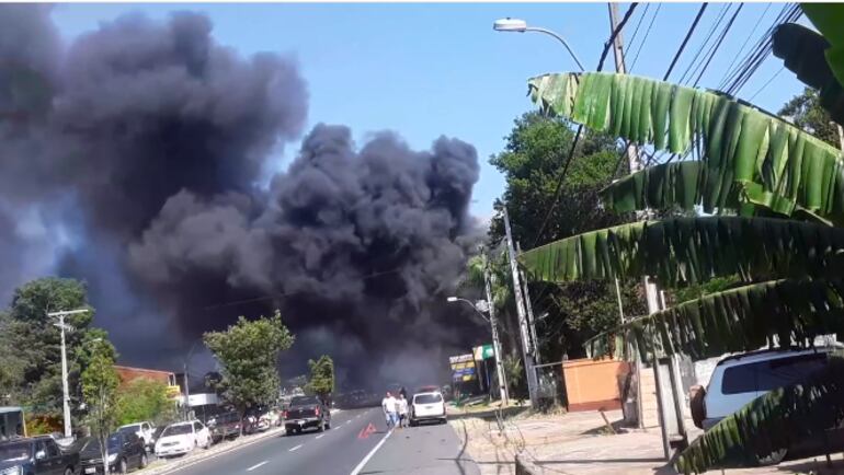 Una densa humareda negra cubrió toda la zona y el tráfico vehicular tuvo que ser cortado actualmente en el carril de salida de la ciudad, con dirección a Capiatá, mientras agentes de la Patrulla Caminera realizaban los desvíos correspondientes.