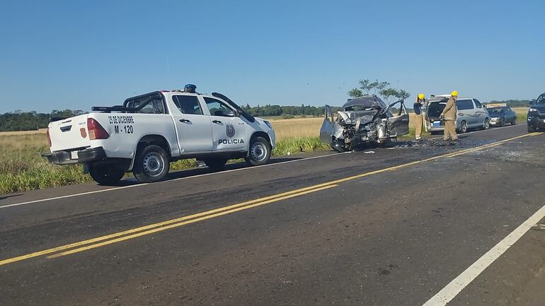 Intervienen bomberos voluntarios, la Policía Nacional y el Ministerio Público de San Estanislao tras el mortal accidente rutero.