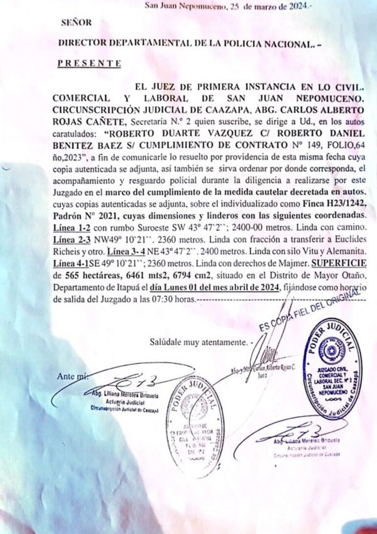 El director departamental de la Policía Nacional en Itapúa, Comisario General Carlos Acosta, encabezó un acompañamiento a una constitución judicial emanada por un juez de San Juan Nepomuceno de la circunscripción judicial de Caazapá, Carlos Alberto Rojas Cañete, para medir un terreno que se encuentra en litigios judiciales. Para el procedimiento arribaron hasta el lugar 15 patrulleras con 50 efectivos policiales el pasado lunes.