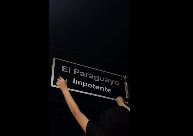 La cuenta de Instagram @Shittyartx compartió ayer una foto y un video en los que se ve cómo un “artista urbano” y activista decidió “cambiar” los nombres de las calles asuncenas El Paraguayo Independiente a “Paraguayo Impotente”, e Independencia Nacional a “Negligencia Nacional”, en la cartelería vial ubicada a metros de la Comandancia de la Policía.