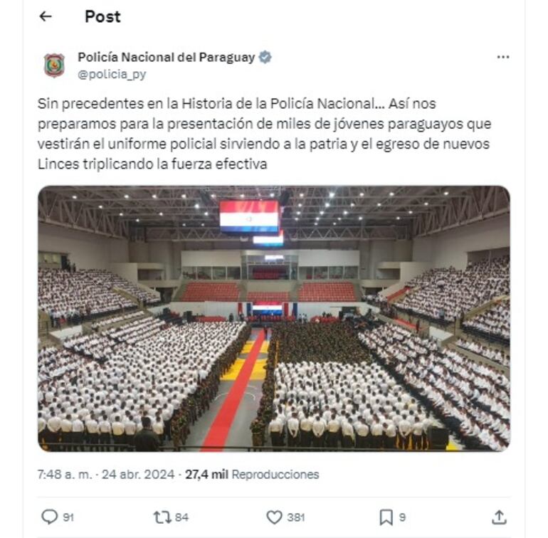 En sus redes sociales, la Policía Nacional se jactó por la magnitud del acto, ignorando lo sucedido. “Sin precedentes en la historia de la Policía Nacional. Así nos preparamos para la presentación de miles de jóvenes paraguayos que vestirán el uniforme policial sirviendo a la patria y el egreso de nuevos Linces triplicando la fuerza efectiva”, señalaron en su cuenta oficial de X.