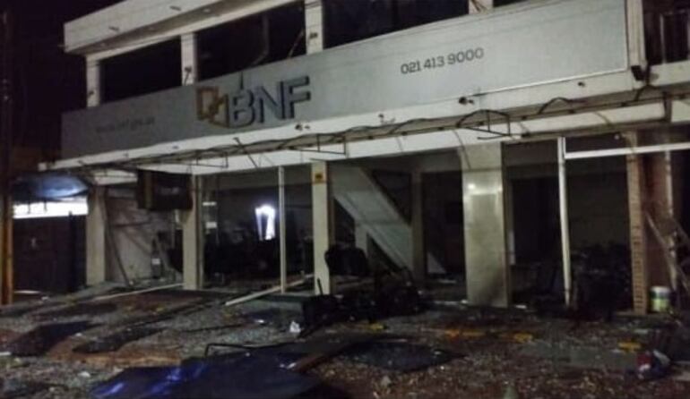 La sede del BNF de Natalio, Itapúa, quedó totalmente destruida tras ser asaltada por un grupo criminal tipo comando.