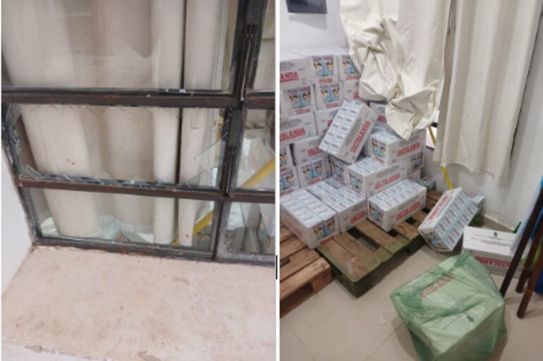 Cinco litros de leche en cartón fueron robados por malvivientes que rompieron el vidrio de la ventana, por donde sacaron los insumos; sin embargo, no lograron ingresar para sacar más. También intentaron alcanzar una impresora, que cayó al suelo.
