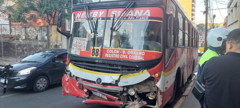 En la intersección entre las calles Brasil y Teniente Fariña de Asunción, un bus de la Línea 88, de la empresa La Lomita SA, impactó contra una camioneta tipo Kia Sorento. El accidente se produjo poco antes de las 06:00 de este miércoles.
