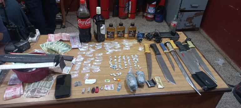 En el procedimiento se incautaron de G. 3.369.000 en efectivo, 8 machetillos, una botella de wisky, cuatro cargadores, un chip de la compañía Tigo, pendrive y otros objetos. Además, 44 dosis de cocaína (8,6g), 77 dosis de crack (31,3g) y dos bolsitas de marihuana (149,4g).