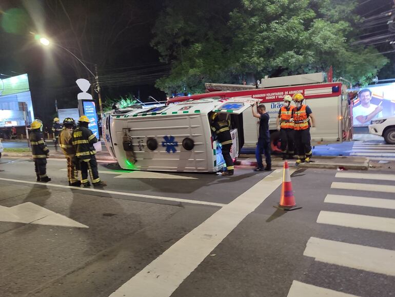 Un insólito accidente de tránsito se produjo en la madrugada de este jueves en la intersección de la avenida Mariscal López y la calle General A. Garay, en el barrio Villa Morra de Asunción. Una ambulancia del Hospital de Policía Rigoberto Caballero volcó luego de ser embestida por una camioneta del Ministerio de Salud Pública, dejando como saldo dos heridos leves.