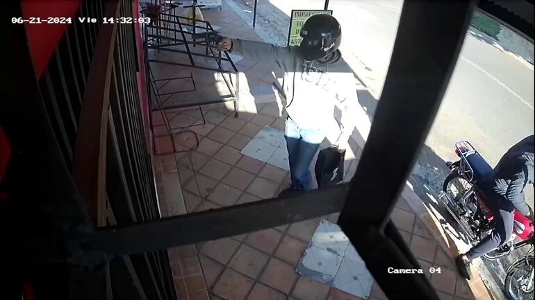 Las imágenes registradas por las cámaras de seguridad capturan la llegada de los malvivientes al establecimiento en motocicleta. Uno de ellos desciende del vehículo e ingresa al local con un arma de fuego en mano, intimidando a los empleados para que entreguen el dinero de la recaudación del día.