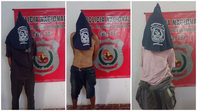 Tras la denuncia del hecho, agentes policiales acudieron al lugar y realizaron un rastrillaje en la zona. Como resultado del operativo, se logró la captura de Mario Alberto Olmedo Riquelme, de 34 años, quien cuenta con antecedentes penales por hurto agravado; Higinio Meza Jara, de 45 años, con antecedentes por lesión grave, hurto agravado y hurto; y Talhia Catalina Cabañas Rodríguez, de 27 años.