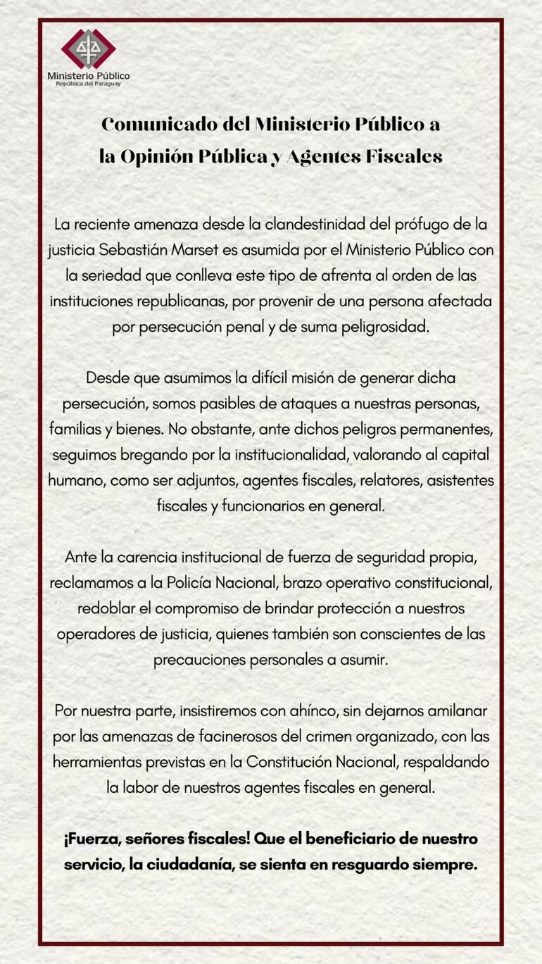 En un comunicado emitido este martes, el Ministerio Público se dirigió a la opinión pública y agentes fiscales con relación a la “amenaza desde la clandestinidad del prófugo de la Justicia Sebastián Marset”. La institución sostiene que asumen el hecho “con la seriedad que conlleva” y agrega son conscientes de que son pasibles de ataques hacia ellos y sus familiares.