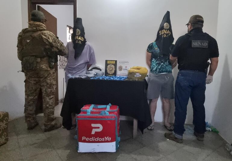 Agentes Especiales de la Secretaría Nacional Antidrogas (Senad) de la Dirección de Operaciones Urbanas, acompañados por el fiscal Marco Amarilla, realizaron un allanamiento que desmanteló un esquema de venta de drogas que empleaba falsos repartidores de comida “Pedidos Ya” para distribuir estupefacientes.