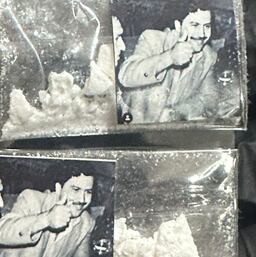 En el departamento fueron hallados 4.7g de cocaína distribuidas en 9 dosis con la imagen de Pablo Escobar; 1.3g de marihuana; dinero G. 100.500, 3 dólares americanos y 20 pesos argentinos; un martillito picador de metal; un paquete de bolsitas ziploc y varios sticker de fantasías con la imagen de cannabis.