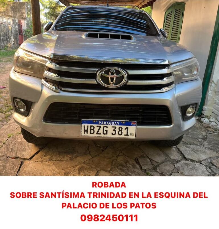 En uno de los casos de robo de vehículo, en la noche del miércoles fue robada una camioneta Toyota Hilux plateada, con chapa WBZG 381, que estaba estacionada frente al edificio Palacio de los Patos, sobre la avenida Santísima Trinidad, en la jurisdicción de la comisaría 12° de Asunción.