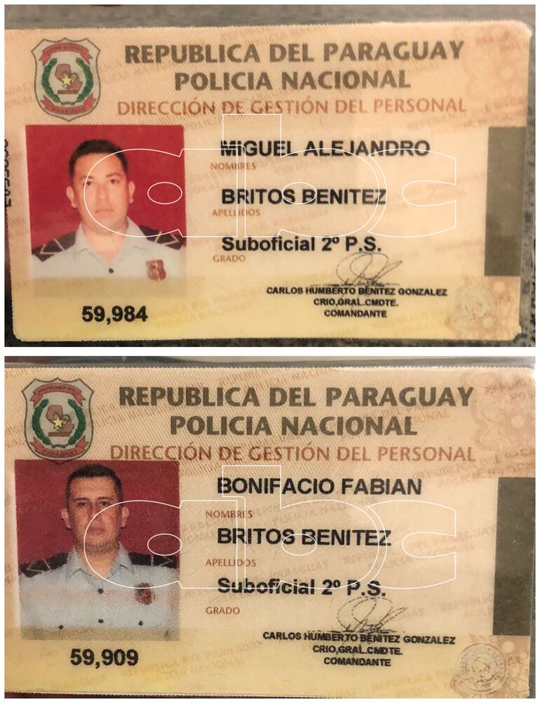 Los paraguayos detenidos en el país vecino son Miguel Alejandro Britos Benítez y Bonifacio Fabián Britos Benítez, ambos de 28 años de edad y que ostentan el grado de suboficial segundo de la Policía Nacional del Paraguay.