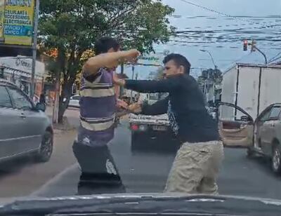 El video muestra a ambos hombres empujándose y golpeándose en la vía pública mientras el semáforo permanecía en rojo.