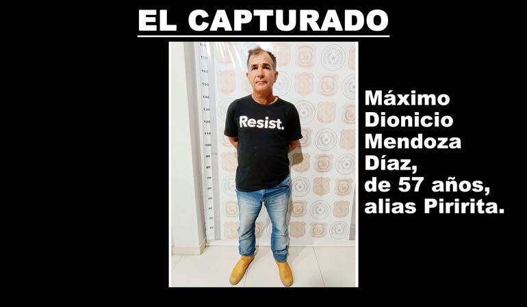 El sospechoso de homicidio del policía ocurrido durante un asalto en Coronel Oviedo que fue capturado es Máximo Dionicio Mendoza Díaz, de 57 años, alias Piririta, cuya detención se produjo aproximadamente a la 01:00 en una casa de la compañía 8 de Diciembre del distrito de Juan de Mena, departamento de Cordillera, a seis kilómetros del casco urbano.