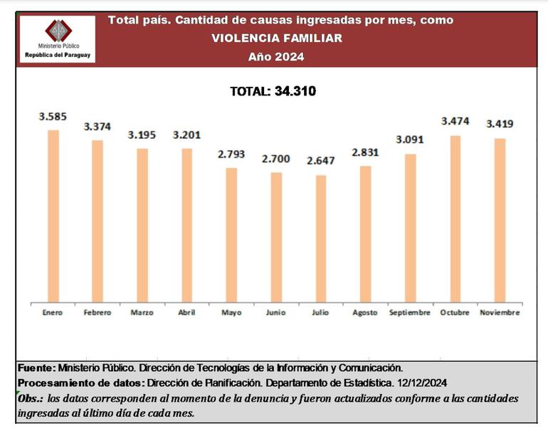 Entre enero y noviembre de este año, se reportaron 34.310 denuncias de violencia familiar en todo el país. Durante los primeros ocho meses del año, las cifras se mantuvieron relativamente estables, pero a partir de septiembre comenzaron a aumentar de forma significativa: septiembre cerró con 3.091 denuncias, octubre con 3.474, y noviembre con 3.419.