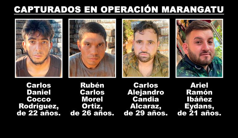 Los detenidos en la operación Marangatu resultaron ser Carlos Daniel Cocco Rodríguez, de 22 años; Rubén Carlos Morel Ortiz, de 26 años; Carlos Alejandro Candia Alcaraz, de 29 años, y Ariel Ramón Ibáñez Eydans, de 21 años.