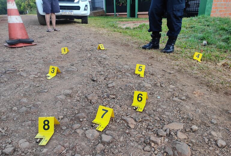 Personal técnico del Departamento de Criminalística halló en el lugar ocho vainas servidas y percutidas de calibre 9 mm. De estas, tres impactaron contra el parabrisas trasero de un automóvil, tres contra la vivienda y dos contra la reja.