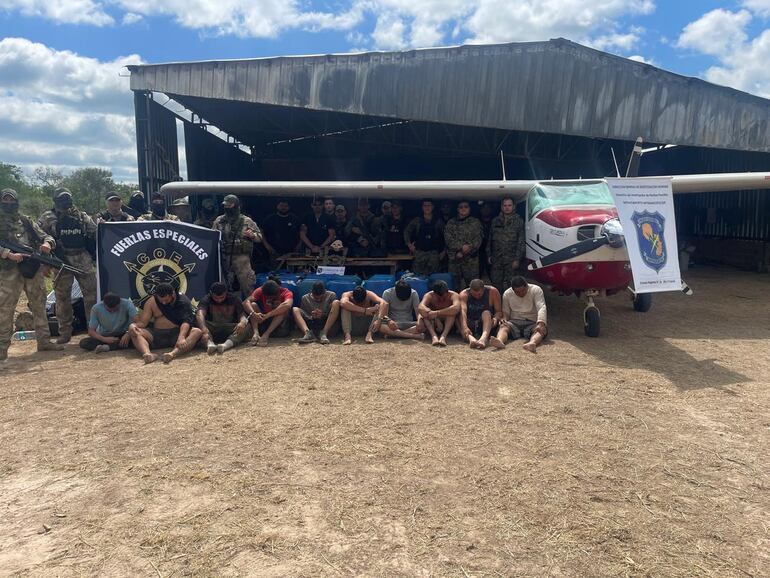 La comitiva encontró en ese momento no solo a los 10 presuntos narcos, que tenían dos fusiles Colt calibre 7.62, sino también una avioneta Cessna 210 que tenía adherida una matrícula CP-3177 de Bolivia, que en realidad corresponde a un helicóptero.