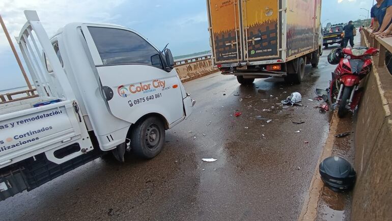 Una motociclista fue atropellada por detrás por un camión de la marca Hyundai (2020) color blanco, con matrícula AAGF 386, la tarde de este jueves en el puente Quiteria de la ciudad de Encarnación, en el kilómetro 365 de la ruta PY01. Producto de la colisión, la motocicleta fue aplastada contra otro camión de mayor porte que estaba parado en frente.