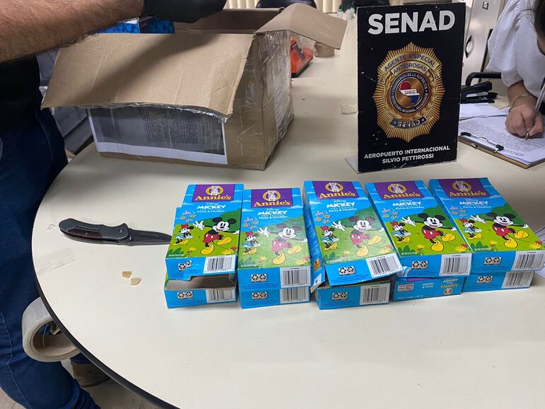 Dentro de la caja principal se encontraban ropas infantiles con el logotipo de Mickey Mouse y, entre ellas, había una caja más grande con un paquete de 782 gramos de marihuana.