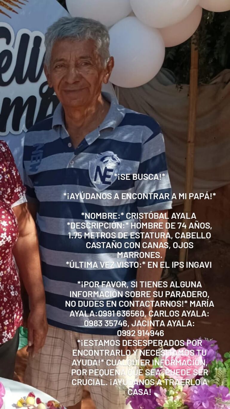 La familia solicita la colaboración urgente de la ciudadanía. Cualquier persona que lo haya visto o tenga información sobre su paradero puede comunicarse al 911, o contactar directamente a su hija, Jacinta Ayala, al número 0992 914 946 o al 0991 636560.