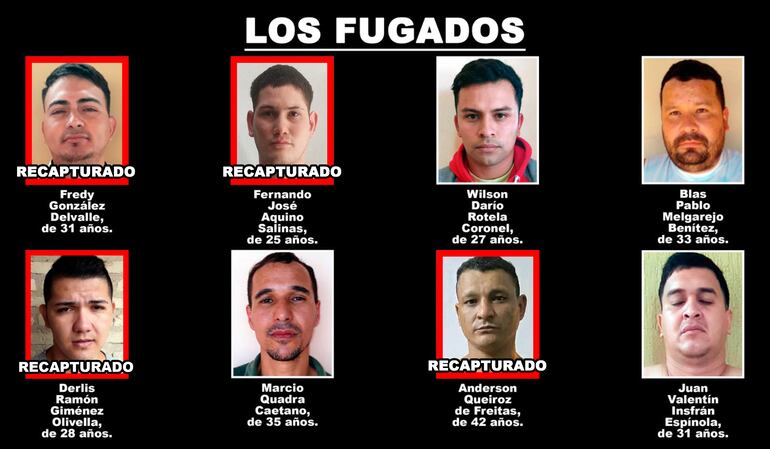 Los demás evadidos fueron los paraguayos Fredy González Delvalle, de 31 años, ya recapturado; Fernando José Aquino Salinas, de 25 años, ya recapturado; Wilson Darío Rotela Coronel, de 27 años, aún prófugo; Blas Pablo Melgarejo Benítez, de 33 años, aún prófugo; y Juan Valentín Insfrán Espínola, de 31 años, aún prófugo.