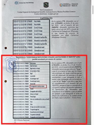 Esos mensajes fueron hallados en el celular de Alex que fue incautado tras su captura, el 19 de agosto de 2024 en Pedro Juan Caballero, en el marco de la operación Pavo Real 2.