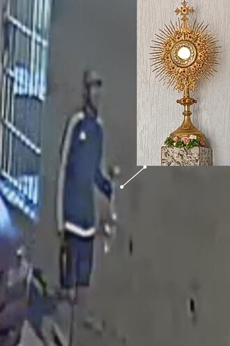 En las imágenes de circuito cerrado del interior de la Parroquia Las Mercedes de Asunción, se ve que a la 01:57, un delincuente accede al sagrario y un minuto después sale con la custodia del Santísimo en la mano, luego de haber buscado objetos de valor en el espacio.