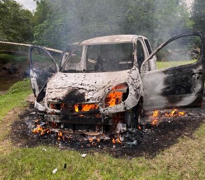 Al arribar, encontraron un Toyota Funcargo incendiado y ya consumido parcialmente por las llamas. El rodado coincidía plenamente con el vehículo empleado por los autores del asalto, según los datos preliminares.