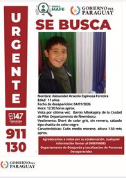 Alexander Arsenio Espinoza Ferreira, de 11 años de edad, se encuentra desaparecido desde el mediodía de este domingo, según la denuncia presentada a las 16:00 hs por su madre, Gladys Beatriz Ferreira, en la Comisaría 3ª de Villa Paso