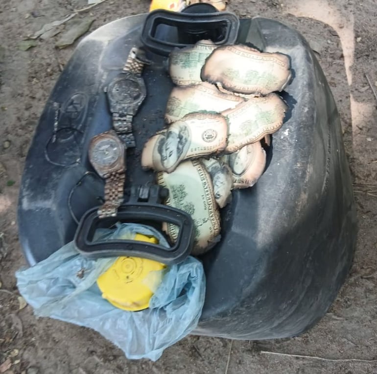 Durante un cateo realizado ayer al Cessna 210, con matrícula boliviana CP-3187, que fue encontrado totalmente calcinado el sábado último en el departamento de Concepción se encontraron varios billetes de dólares, cuatro relojes presumiblemente de la marca Rolex y Bulova, cartuchos calibre 5.56 y hasta un cargador del mismo calibre, según informaciones recibidas por ABC Color.
