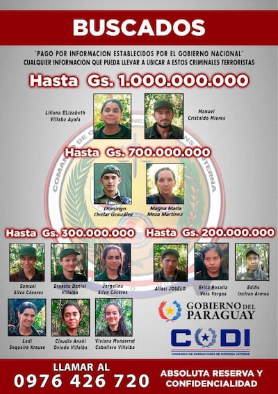 De igual forma, se establece una recompensa de hasta G. 200 millones por información que conduzca a los integrantes identificados como alias Joselo, Edita Rosalía Guerra Vargas y Edinho Izfrán Armoa.