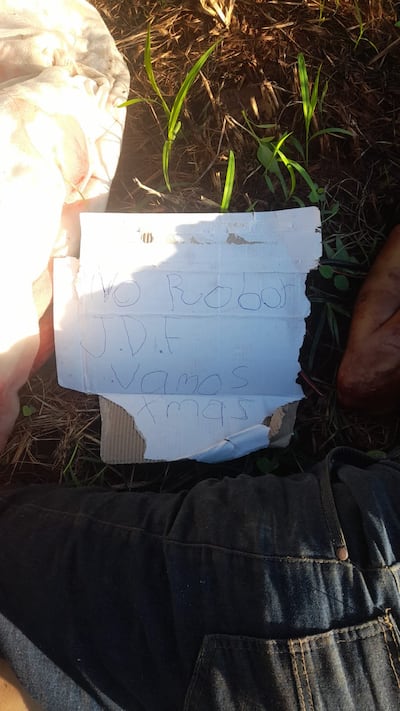Además, tenía los pies atados con una cuerda y, cerca del cuerpo, se encontró una pancarta con la inscripción “no robar” y las siglas J.D.F. Se presume que los autores del crimen serían miembros de un grupo de exterminio de supuestos delincuentes, autodenominados “Justicieros de la Frontera”, teoría que se refuerza teniendo en cuenta las características del homicidio y el perfil del fallecido.