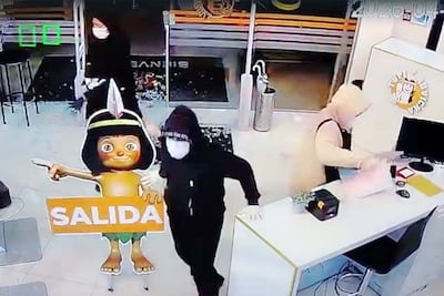 Las cámaras de seguridad del negocio grabaron a cuatro hombres enmascarados que entraron a la tienda tras romper con piedras la puerta de vidrio templado.
