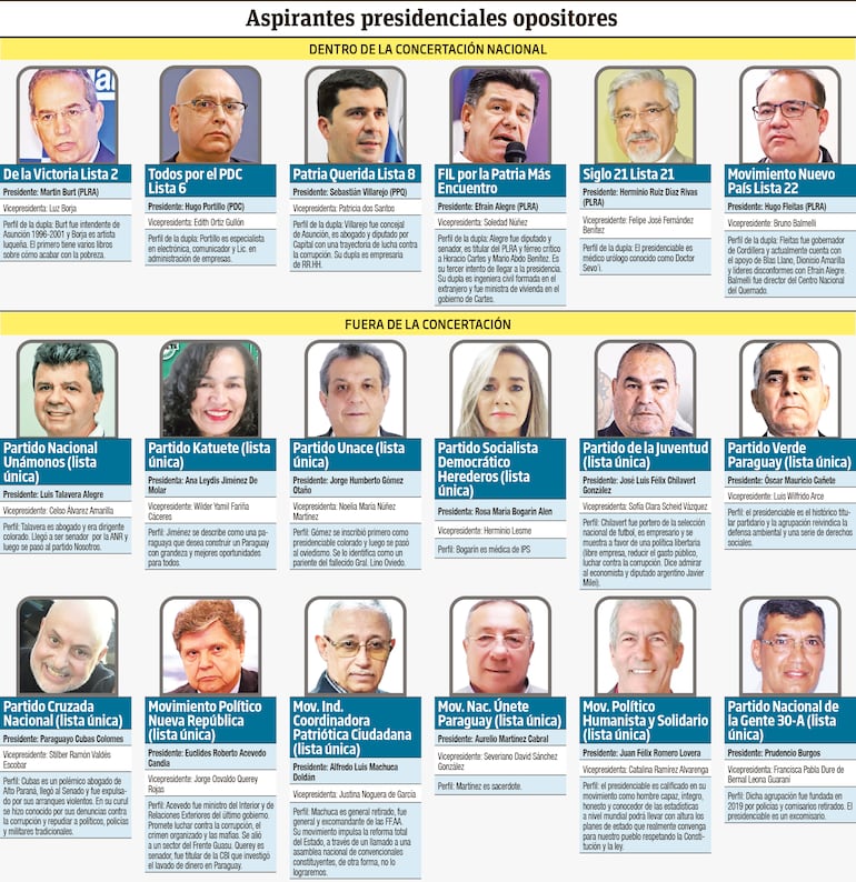 Las elecciones internas presidenciales previstas para el domingo 18 de diciembre tiene 18 propuestas a chapas presidenciales en la oposición ya sea dentro de la Concertación Nacional o por fuera de ella (ver infografía). Mencionamos a los precandidatos presidenciales Efraín Alegre (PLRA) y su dupla a la vicepresidencia Soledad Núñez. Martín Burt (PLRA) y para vicepresidente, Luz Borja.