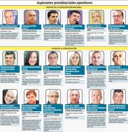 Las elecciones internas presidenciales previstas para el domingo 18 de diciembre tiene 18 propuestas a chapas presidenciales en la oposición ya sea dentro de la Concertación Nacional o por fuera de ella (ver infografía). Mencionamos a los precandidatos presidenciales Efraín Alegre (PLRA) y su dupla a la vicepresidencia Soledad Núñez. Martín Burt (PLRA) y para vicepresidente, Luz Borja.