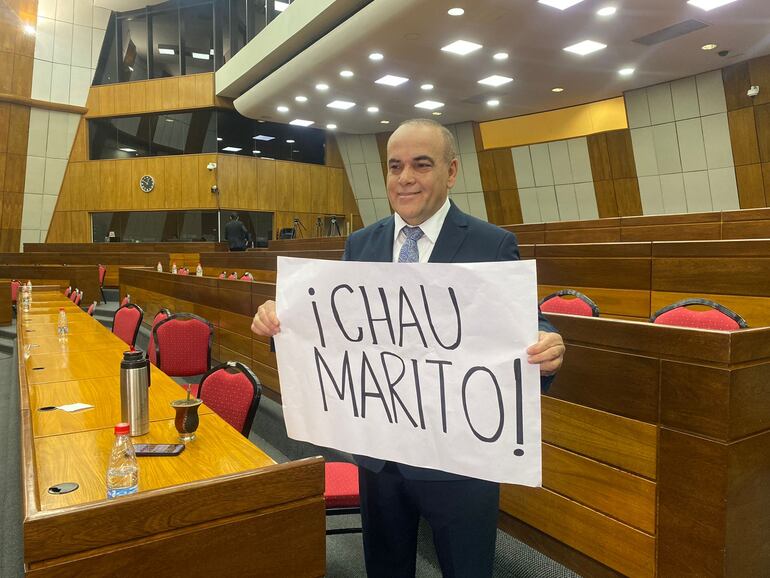 El senador cartista Basilio "Bachi" Núñez despliega un cartel con la leyenda "Chau Marito".