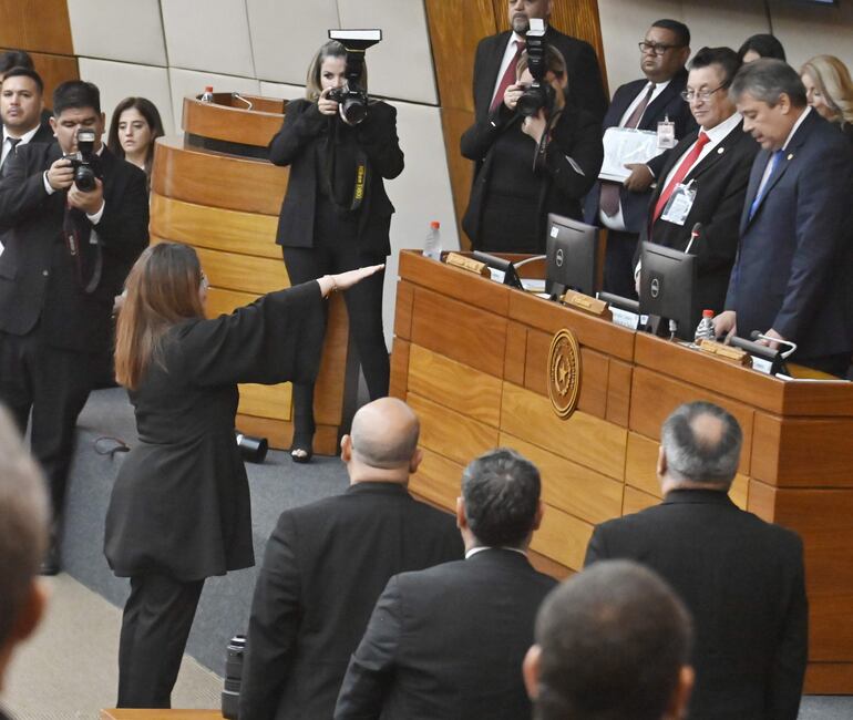 “Quiero invitarle a la diputada Patricia Alexandra Zena Oviedo, que no pudo participar del acto de juramento porque tuvo un problema médico, por lo tanto le vamos a solicitar su presencia, pero necesitamos que los presentes votemos para dar fe de lo que estamos realizando”, afirmó el presidente saliente de la Cámara, Carlos María López (PLRA).