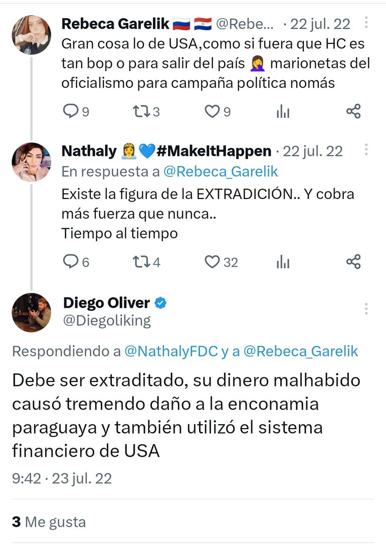 Ante su presencia en la fila para saludar a Horacio Cartes, rápidamente en redes sociales sacaron el “archivo” de Diego Oliver, en que el excandidato aseguraba que HC -a quien busca saludar hoy- debía ser extraditado atendiendo a que su “dinero mal habido causó tremendo daño a la economía paraguaya”.