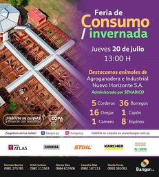La Senabico, a cargo de la ministra Teresa Rojas, invita a la ciudadanía a participar de la Feria especial de consumo e invernada, que llevará a cabo hoy 20 de julio desde las 13:00. Los animales de la Agroganadera e Industrial Nuevo Horizonte SA, propiedad del clan Insfrán, contempla cinco corderos, 36 borregos, 16 ovejas y 1 capón. También están para el remate 1 carnero y 8 equinos.