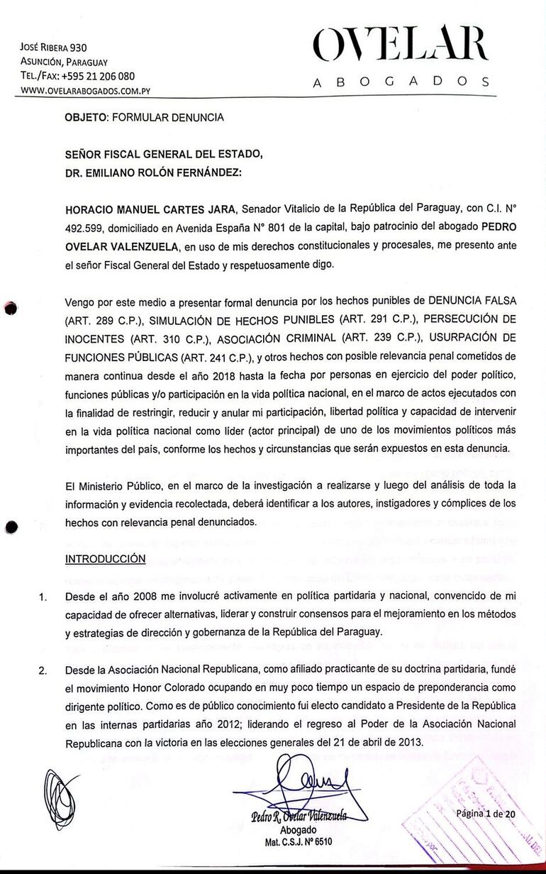 Asimismo, el letrado cita que los siguientes tipos penales fueron “infringidos”: denuncia falsa, simulación de hecho punible, persecución de inocentes, asociación criminal y usurpación de funciones públicas, asegurando que se dio una “persecución política” en contra de Horacio Cartes.